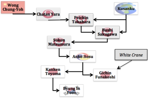 Among those who trained with Ryu Ryu Ko are Wai Xinzain and Kanryo Higa(shi)onna; Arakiko Seisho trained with Wai Xinxain; Gichin Funakoshi studied with both Arakiko Seisho and Kanryo Higa(shi)onna, bringing the trainings from his Okinawan masters to Japan. Of the original creators of Taekwondo, many studied directly or indirectly with Funakoshi while in Japan. Figure 1 shows the network of the White Crane lineage as it is traced from China to Okinawa, to Japan, and finally to Korea.